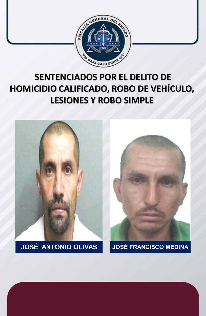 MEXICALI, B.C. - 21 DE NOVIEMBRE DE 2022.- La Fiscalía General del Estado, a través de la Fiscalía Especializada en Delitos Contra la Vida logró una sentencia de 30 años de prisión en contra de dos hombres acusados por los delitos de homicidio calificado, robo de vehículos, lesiones calificadas y robo simple.