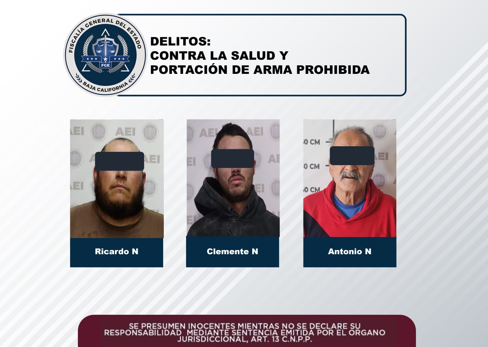 Ensenada, B.C. - Elementos de la Agencia Estatal de Investigación (AEI), de la Fiscalía General del Estado (FGE), cumplimentaron distintas órdenes judiciales que se encontraban activas en contra de dos sujetos involucrados en delitos contra la salud, y a otro por portar un machete en la vía pública.
