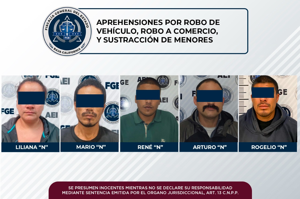 TIJUANA, B.C. - La Agencia Estatal de Investigación, dependiente de la Fiscalía General del Estado, obtuvo mediante trabajo de gabinete y campo, ubicar y detener a cinco personas que contaban con órdenes de aprehensión por diversos delitos relacionados con el robo y la sustracción de menores, en casos por separado.