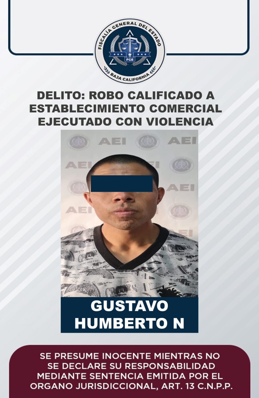 Se trata de Gustavo Humberto “N”, de 27 años de edad, a quien la Fiscalía cumplimentó dos órdenes de aprehensión el pasado 21 de noviembre por el delito de robo calificado a establecimiento comercial o de servicio abierto al público ejecutado con violencia.