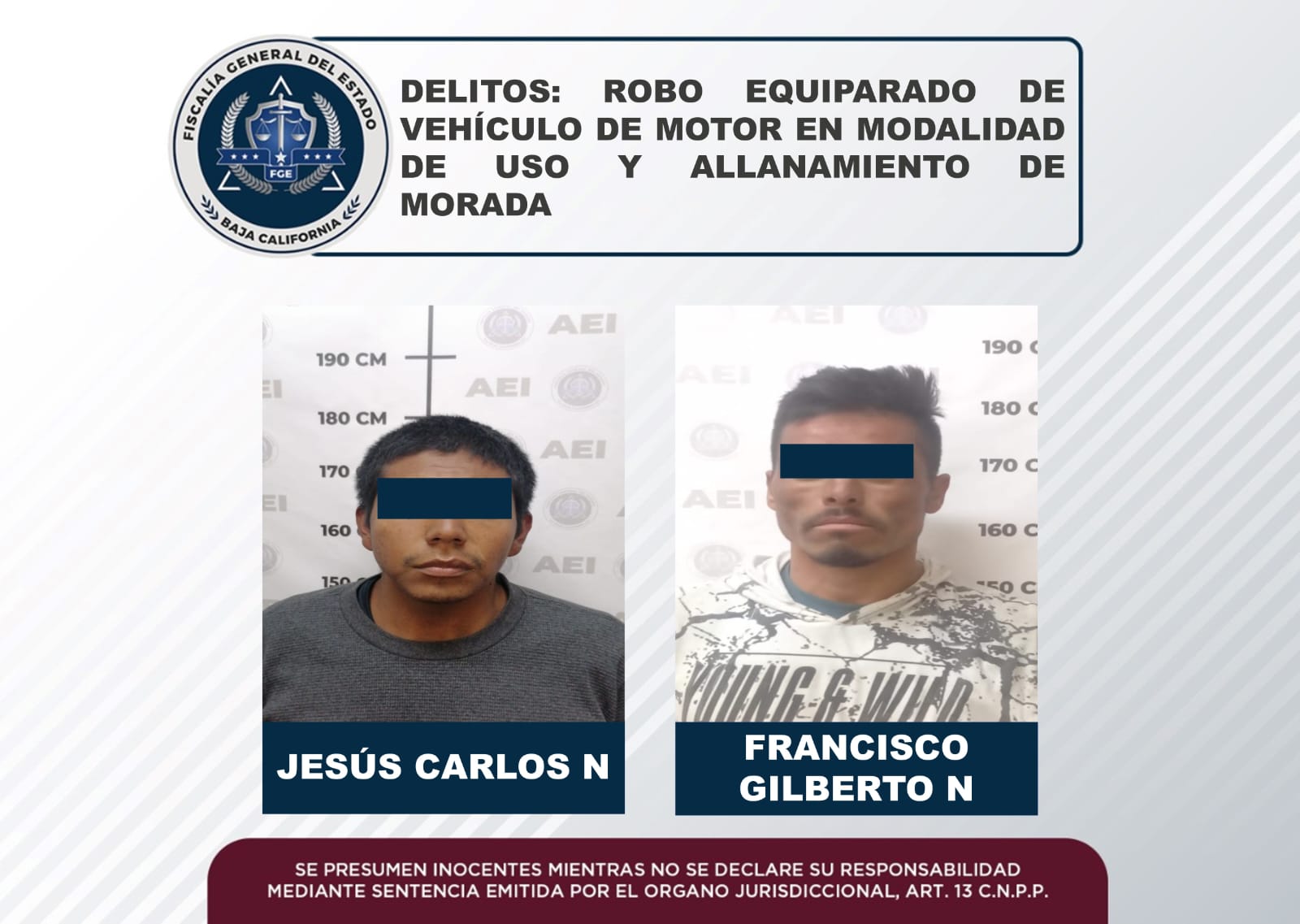 ENSENADA, B.C.- La Fiscalía Regional de Ensenada obtuvo, en casos distintos, auto de vinculación a proceso en contra de dos hombres por los delitos de robo equiparado de vehículo de motor en modalidad de uso y allanamiento de morada.