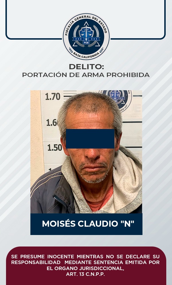 PLAYAS DE ROSARITO, B.C.- Por el delito de portación de arma prohibida, un Juez de Control emitió una orden de aprehensión en contra de Moisés Claudio “N”, misma que fue cumplimentada en días recientes por elementos de la Fiscalía General del Estado.