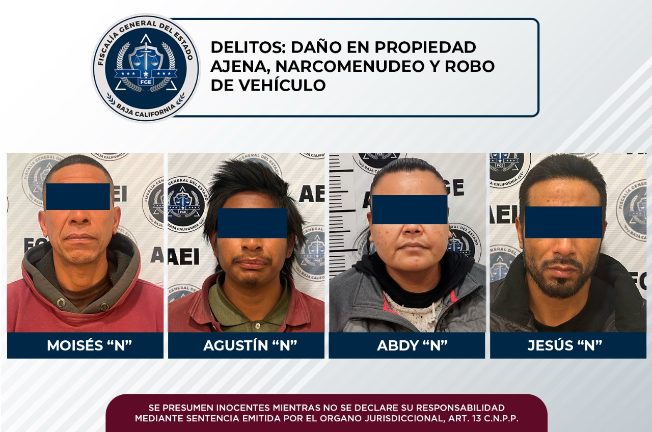 TIJUANA, B.C. - Como resultado de acciones efectivas para hacer que presuntos responsables de la comisión de algún delito rindan cuentas ante la justicia, agentes de Fiscalía General del Estado, cumplimentaron órdenes de aprehensión por daño en propiedad ajena, narcomenudeo y robo de vehículo.