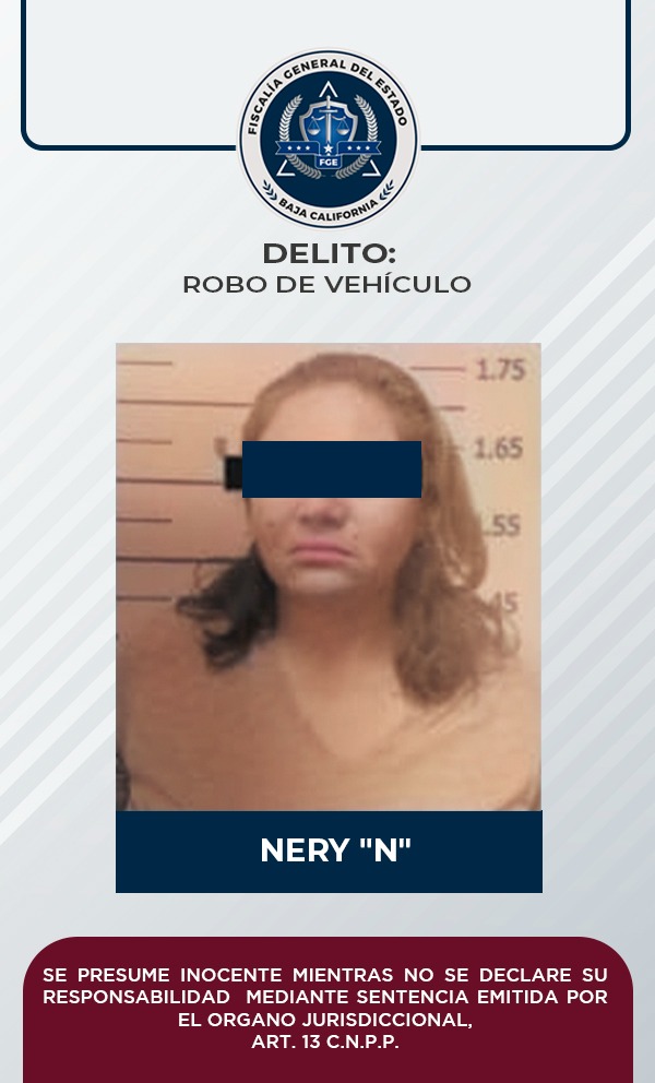 PLAYAS DE ROSARITO, B.C.- Tras reunir datos de prueba que fueron presentados ante la autoridad juzgadora, la Fiscalía General del Estado, a través de la Unidad de Investigación Especializada en Delitos de Robo de Vehículos, obtuvo la vinculación a proceso de una mujer que responde al nombre de Nery “N”.