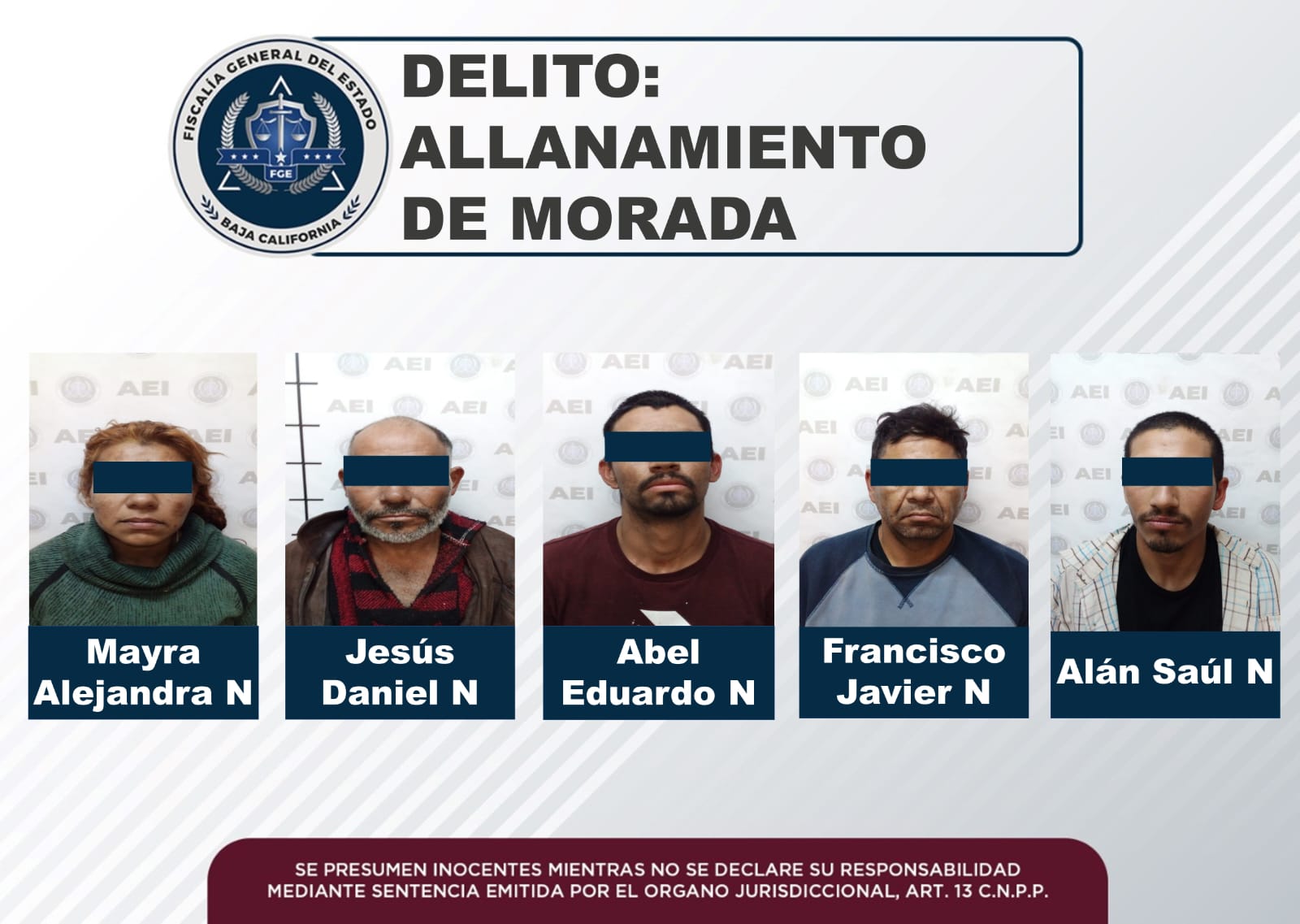 ENSENADA, B.C. - Cinco personas quedaron vinculadas a proceso por el delito de allanamiento de morada, luego de que fueran detenidas en el interior de predios asegurados por la Fiscalía General del Estado en Ensenada.