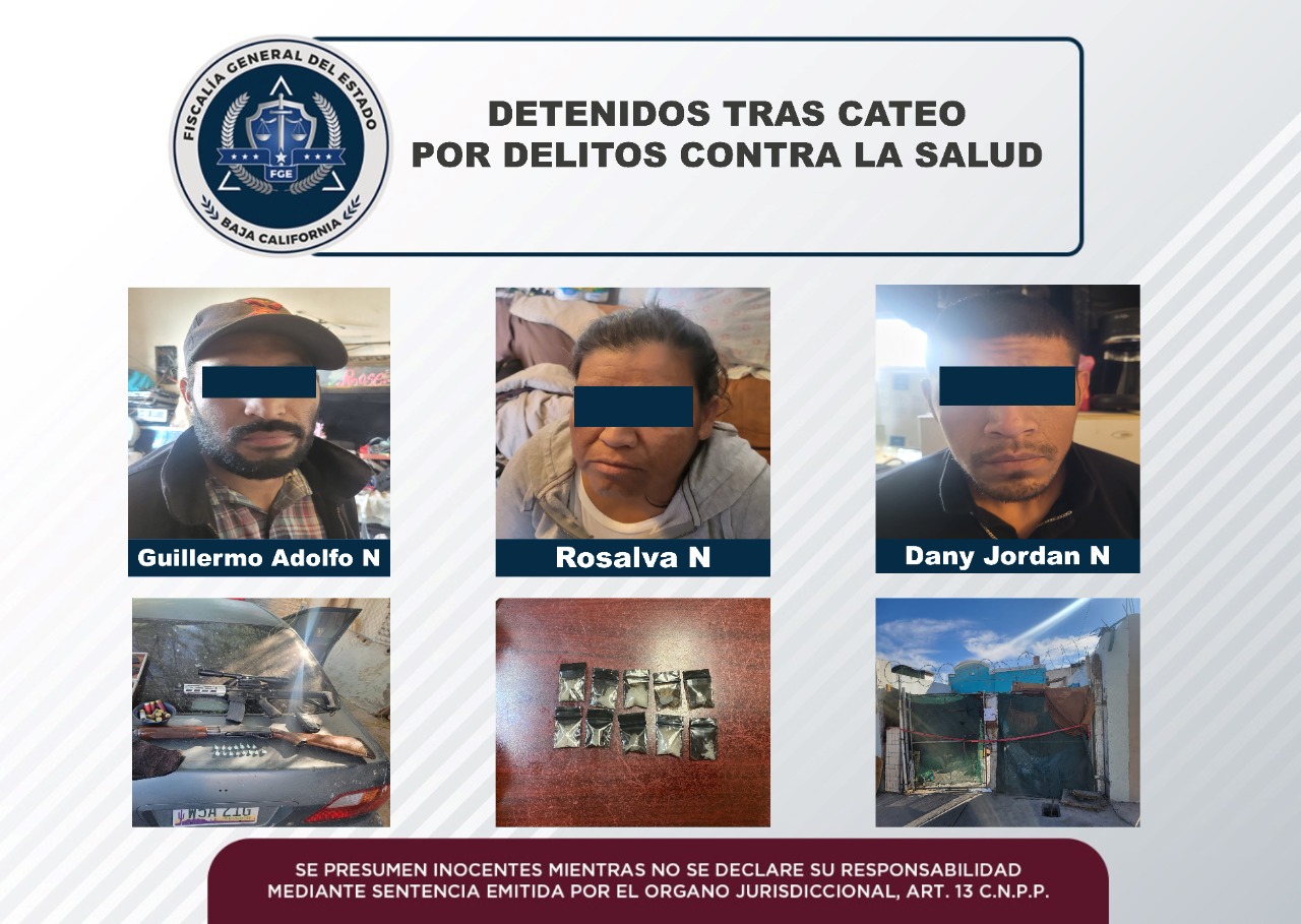 En la segunda diligencia, agentes estatales lograron la detención de Rosalva “N” de 43 años de edad, Guillermo Adolfo “N” de 32 años y Dany Jordan “N” de 30 años, en un domicilio ubicado en el fraccionamiento Quintas del Rey.