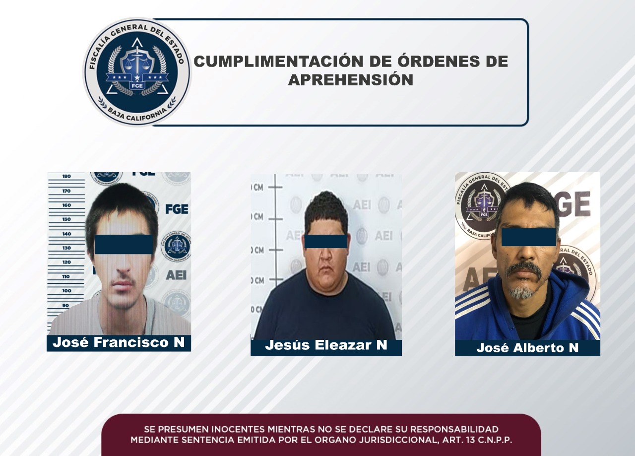 MEXICALI, B.C.- Agentes Estatales de Investigación adscritos a la Fiscalía Regional de Mexicali, cumplimentaron orden de aprehensión en contra de tres individuos por diversos delitos.