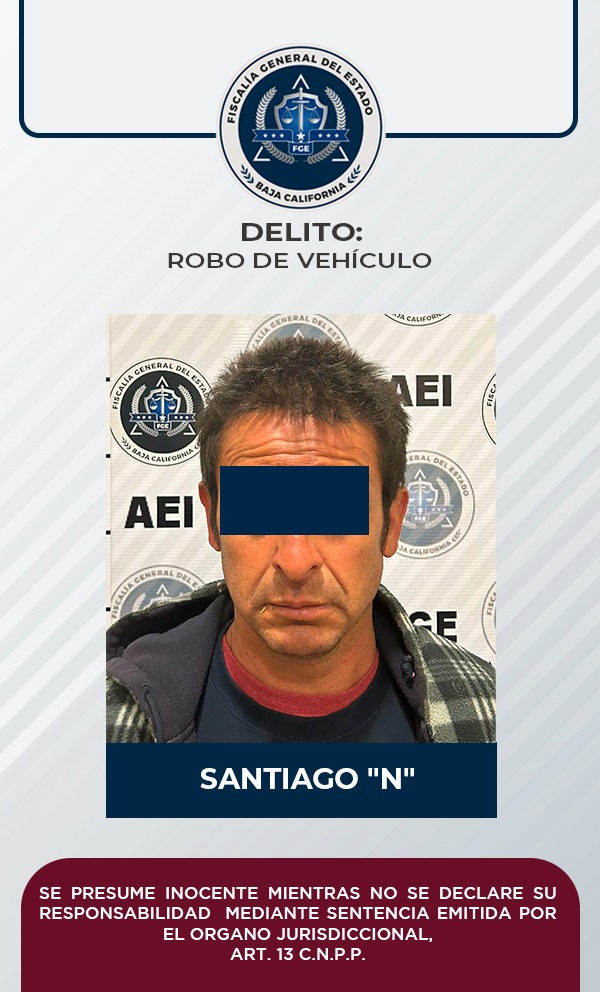 PLAYAS DE ROSARITO, B.C.- Por el delito de robo equiparado de vehículo de motor, agentes de la Fiscalía General del Estado cumplimentaron una orden de aprehensión en contra de Santiago “N”, derivado de un hecho registrado en Playas de Rosarito.