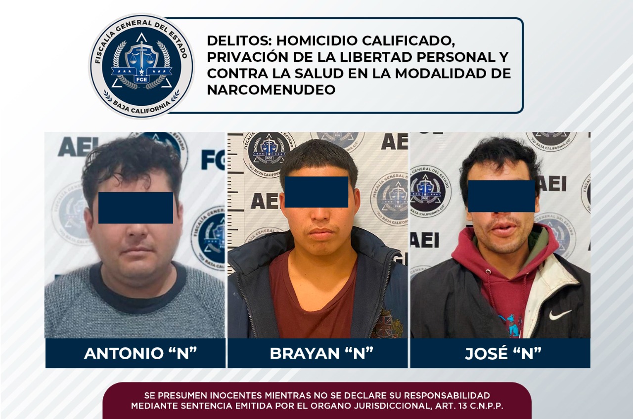 TIJUANA, B.C.- Como resultado de acciones de investigación, elementos de la Fiscalía General del Estado, cumplimentaron orden de aprehensión a tres hombres, por su probable participación en los delitos de homicidio, privación de la libertad personal y narcomenudeo.