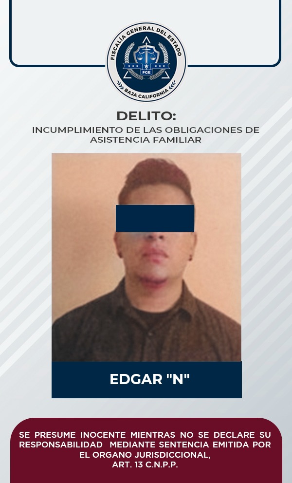 PLAYAS DE ROSARITO, B.C.- Como resultado de investigaciones desarrolladas por la Fiscalía Regional de Playas de Rosarito, se obtuvo la vinculación a proceso de Edgar “N”, acusado del delito de incumplimiento de las obligaciones de asistencia familiar.