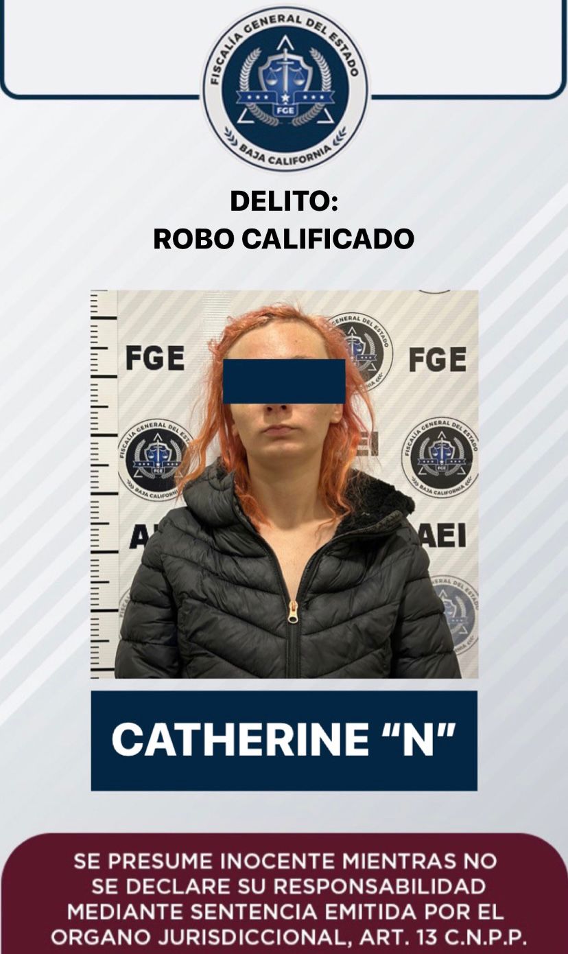 TIJUANA, B.C.- Acorde al compromiso de brindar seguimiento a las denuncias que se emiten por la comisión de delitos, la Fiscalía Regional de Tijuana, logró, con base a elementos de prueba presentados por el Ministerio Público, la vinculación a proceso y medida cautelar de prisión preventiva justificada en contra de Catherine María "N", alias “Lady Pelucas”, por el delito de robo calificado.
