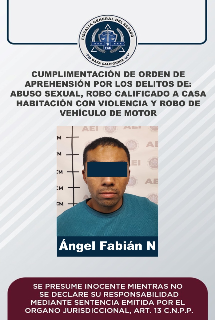 MEXICALI, B.C.- Agentes Estatales de Investigación adscritos a la Fiscalía Regional de Mexicali, a través de la Unidad de Investigación de Robos Oriente, cumplimentaron orden de aprehensión en contra de Ángel Fabián “N”, por presuntamente haber cometido los delitos de abuso sexual, robo calificado a casa habitación con violencia y robo de vehículo de motor.