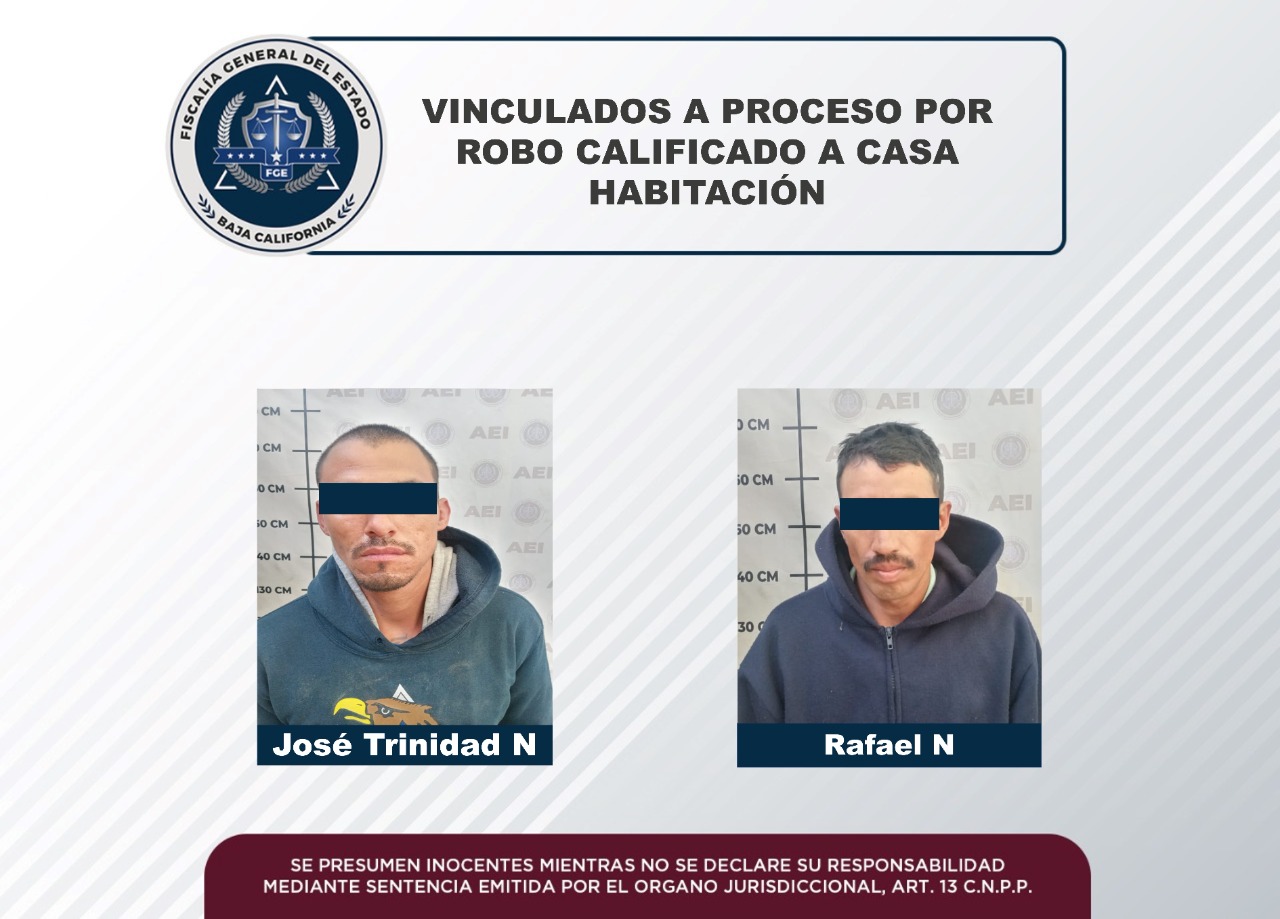 MEXICALI, B.C.- La Fiscalía Regional de Mexicali, a través del trabajo realizado en la integración de la carpeta de investigación a cargo de la Unidad con Detenidos Poniente, obtuvo la vinculación a proceso en contra de José Trinidad “N” y Rafael “N”, por el delito de robo calificado a casa habitación.