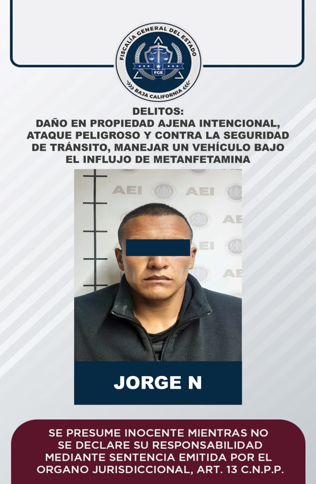 Se trata de Jorge “N”, de 25 años de edad, a quien en días recientes se le cumplimentó orden de aprehensión por los delitos de daño en propiedad ajena intencional, ataque peligroso y contra la seguridad de tránsito, en modalidad de manejar un vehículo de motor bajo el influjo de metanfetamina.