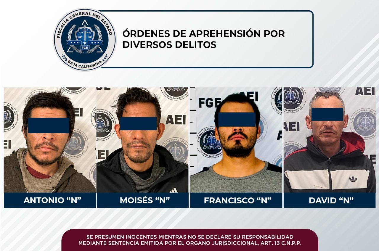 TIJUANA, B.C- Elementos de la Agencia Estatal de Investigación (AEI), pertenecientes al Grupo de Aprehensiones Tijuana, capturaron a cuatro hombres que se encontraban prófugos de la justicia por diversos delitos.