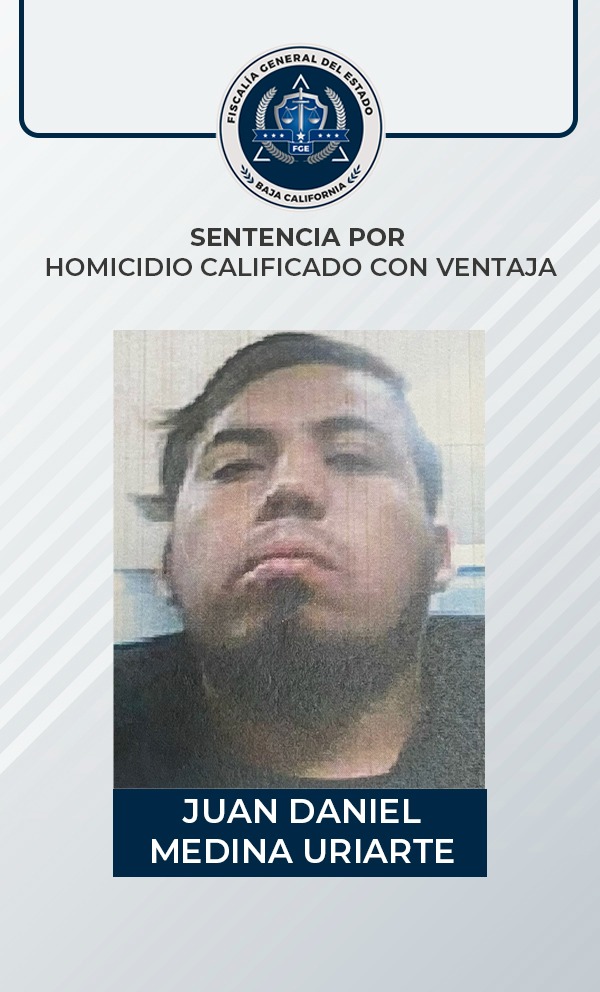 TIJUANA, B.C.- Con base a elementos de prueba expuestos por la Fiscalía General del Estado (FGE) fue que se obtuvo por parte de un Juez una sentencia de 60 años de prisión en contra de Juan Daniel Medina Uriarte, por su responsabilidad en el delito de homicidio calificado con ventaja.