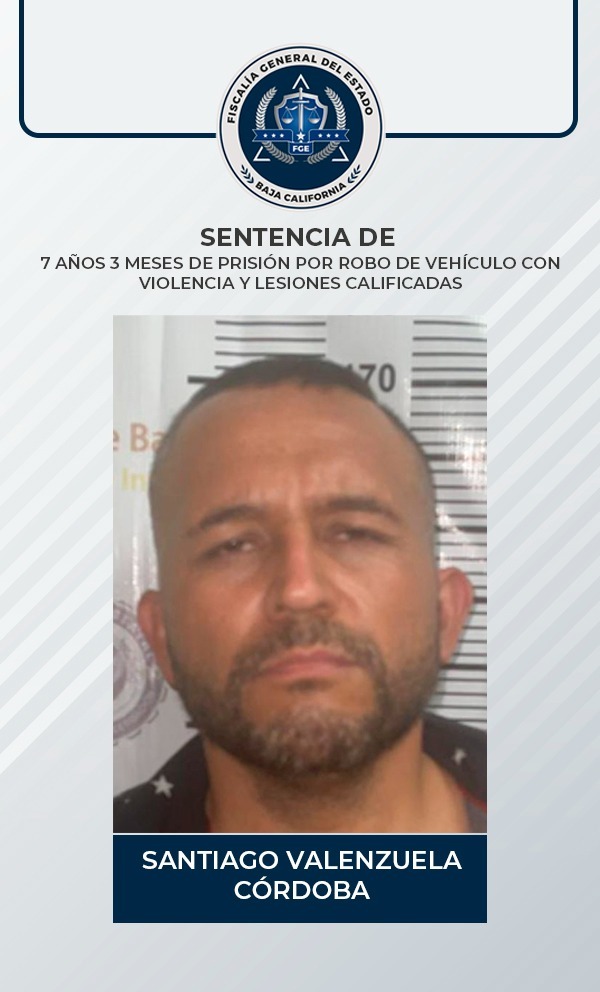 TIJUANA, B.C.- 9 DE DICIEMBRE DE 2022.- La Fiscalía General del Estado, con las pruebas presentadas por el Ministerio Público, logró que se le impusiera pena de prisión de 7 años y 3 meses a Santiago Valenzuela Córdoba, quien resultó responsable de los delitos de robo de vehículo con violencia y lesiones calificadas.