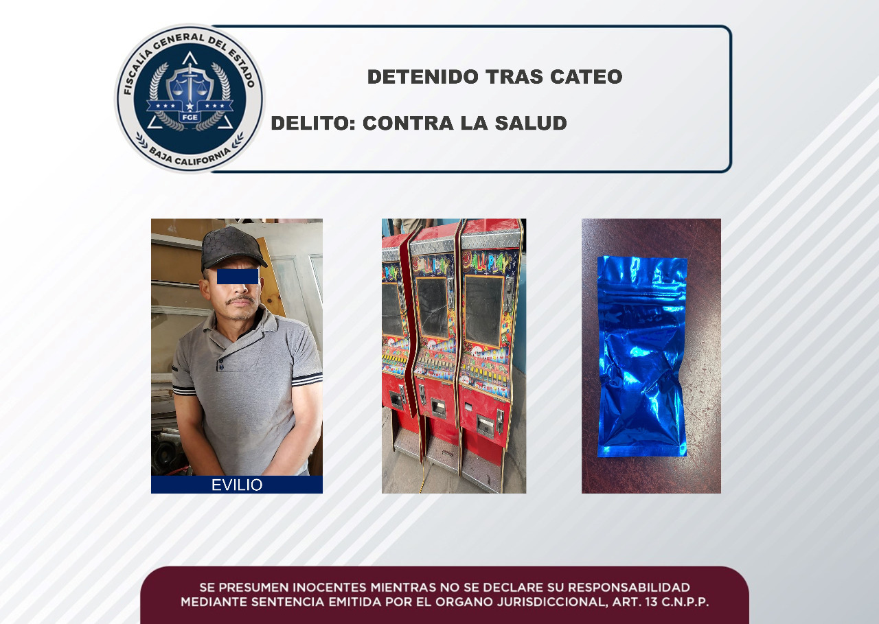 MEXICALI, B.C.- Como resultado al seguimiento a una denuncia anónima sobre actividades ilícitas en una vivienda del fraccionamiento Mirasol, la Fiscalía General del Estado, a través de la Fiscalía Especializada en Narcomenudeo, aseguraron drogas, máquinas tragamonedas y detuvieron a un hombre.