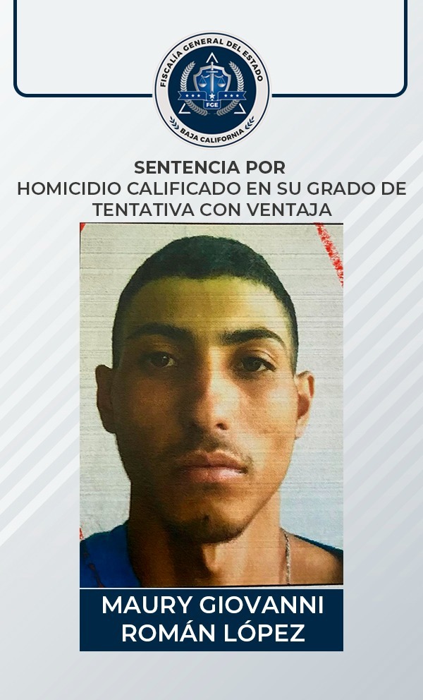 TIJUANA, B.C.- 10 DE DICIEMBRE DE 2022.- Como resultado de las evidencias y elementos de prueba que el Ministerio Público presentó ante la autoridad juzgadora, tras una investigación por el delito de homicidio calificado en su grado de tentativa con ventaja, la Fiscalía General del Estado, logró una sentencia condenatoria de 13 años 4 meses en prisión, para Maury Giovanni Román López.
