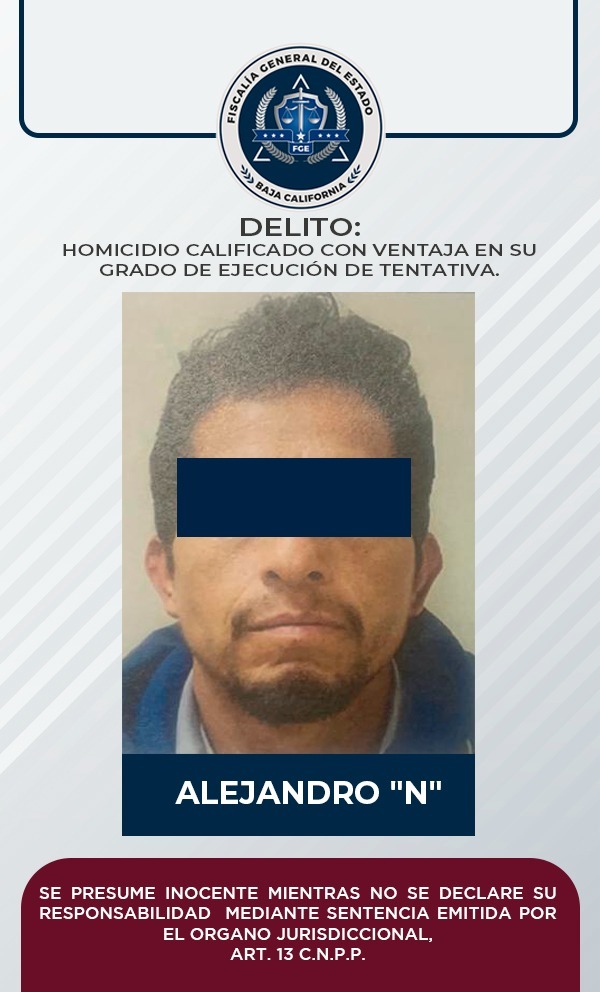 TIJUANA, B.C. - Como resultado de labores de investigación llevadas a cabo por la Fiscalía General del Estado, fue posible obtener la vinculación a proceso de Alejandro “N”, por el delito de homicidio calificado con ventaja en su grado de ejecución de tentativa.