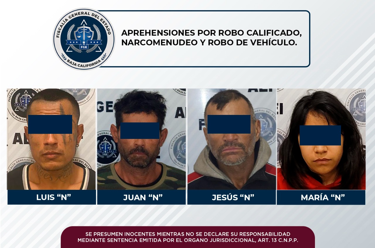 TIJUANA, B.C.- Agentes estatales de investigación de la Fiscalía General de Baja California, cumplimentaron cuatro órdenes de aprehensión en contra de tres hombres y una mujer, quienes eran requeridos por jueces penales de la ciudad.