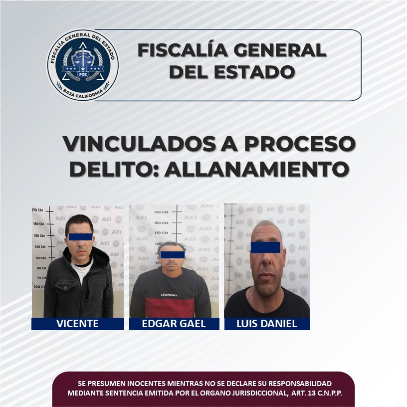 MEXICALI, B.C. Cuatro hombres acusados por el delito de allanamiento de morada, fueron vinculados a proceso en audiencias por separado, con base a los elementos de prueba aportados por la Fiscalía Regional de Mexicali, a través de la Unidad de Investigación con Detenidos Poniente.
