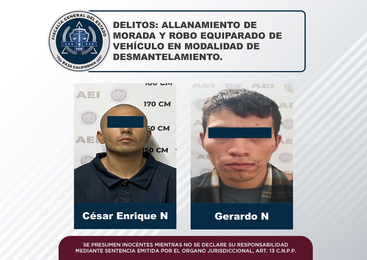 ENSENADA, B.C. La Fiscalía General del Estado (FGE), en Ensenada, cumplimentó órdenes de aprehensión a dos sujetos por los delitos de allanamiento de morada y robo equiparado de vehículo de motor en modalidad de desmantelamiento.