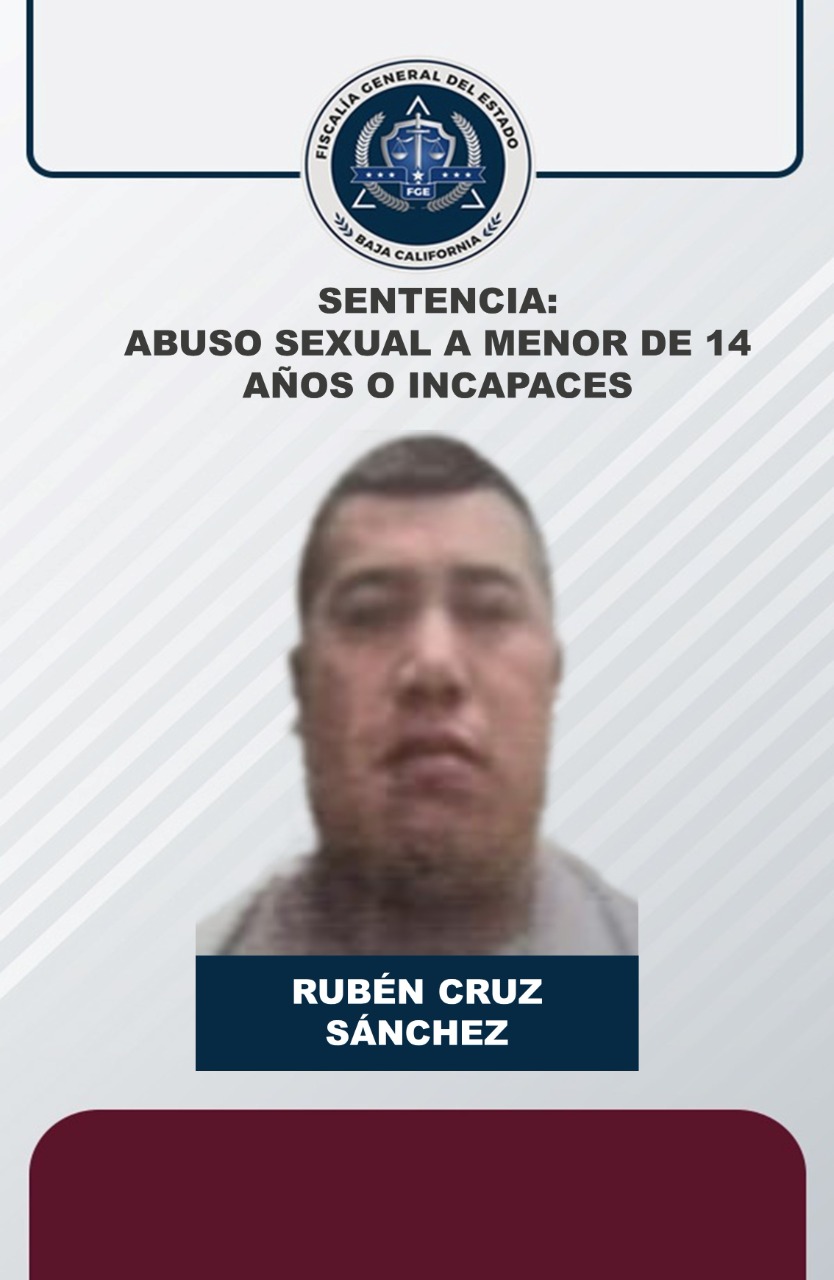 ENSENADA, B.C. Por el delito de abuso sexual a menores de 14 años o incapaces, la Fiscalía General del Estado (FGE), obtuvo una sentencia condenatoria de 5 años 4 meses de prisión sin beneficios, contra Rubén Cruz Sánchez.