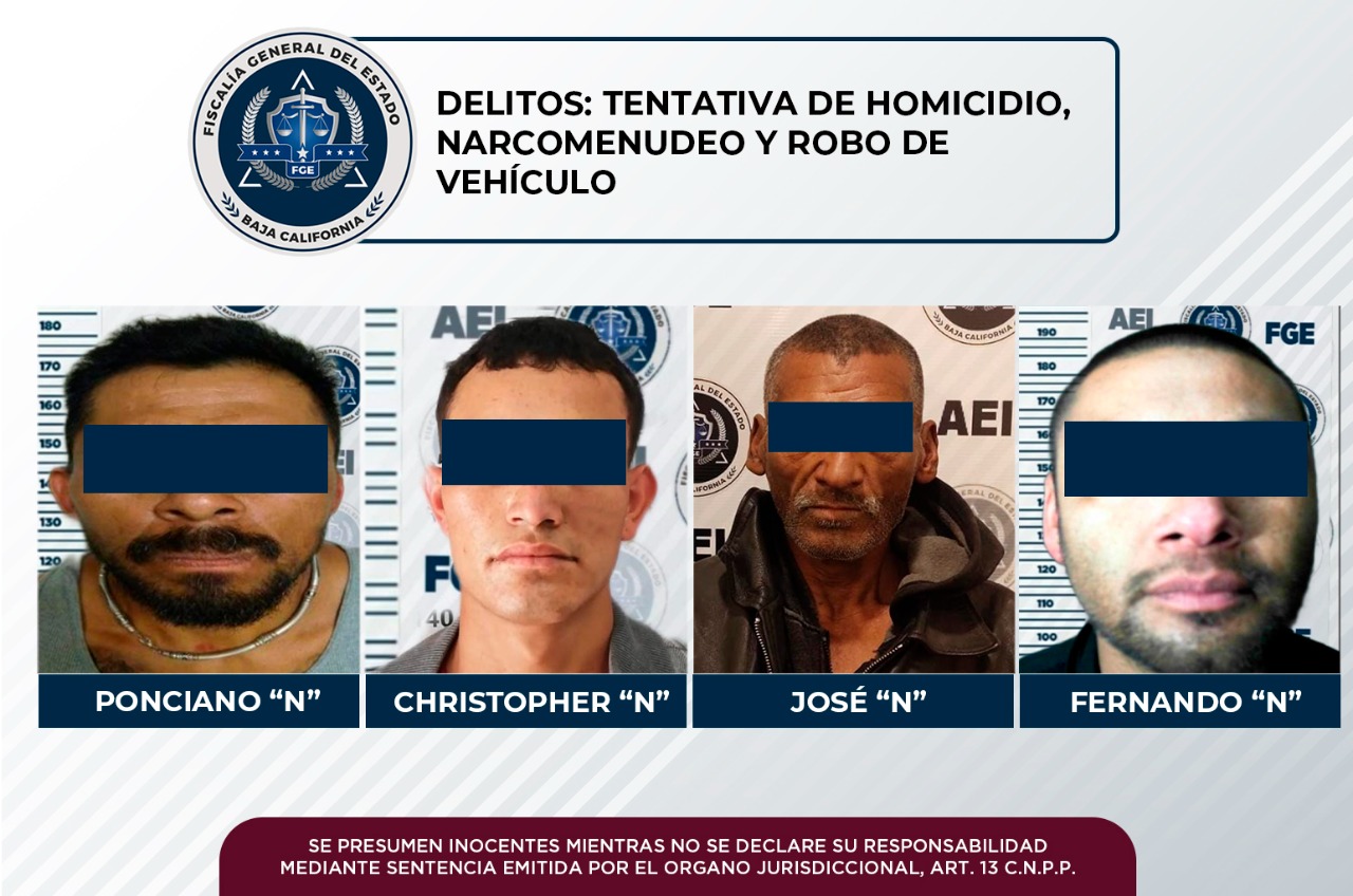 TIJUANA, B.C. Cuatro prófugos de la justicia fueron aprehendidos por agentes estatales de investigación de la Fiscalía General del Estado (FGE), los mandamientos judiciales que pesaban en contra de ellos fueron solicitados por agentes del Ministerio Público ante jueces de control.