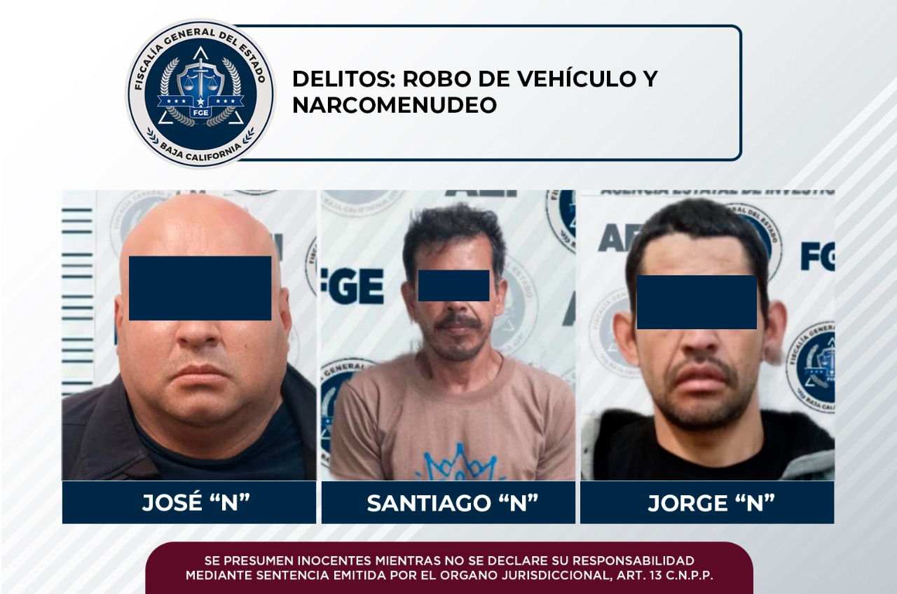 TIJUANA, B.C. Trabajo de investigación desarrollado por agentes de la Fiscalía General del Estado, permitió la cumplimentación de órdenes de aprehensión, en contra de tres hombres que están presuntamente relacionados, en casos distintos, en los delitos de robo de vehículo y narcomenudeo.