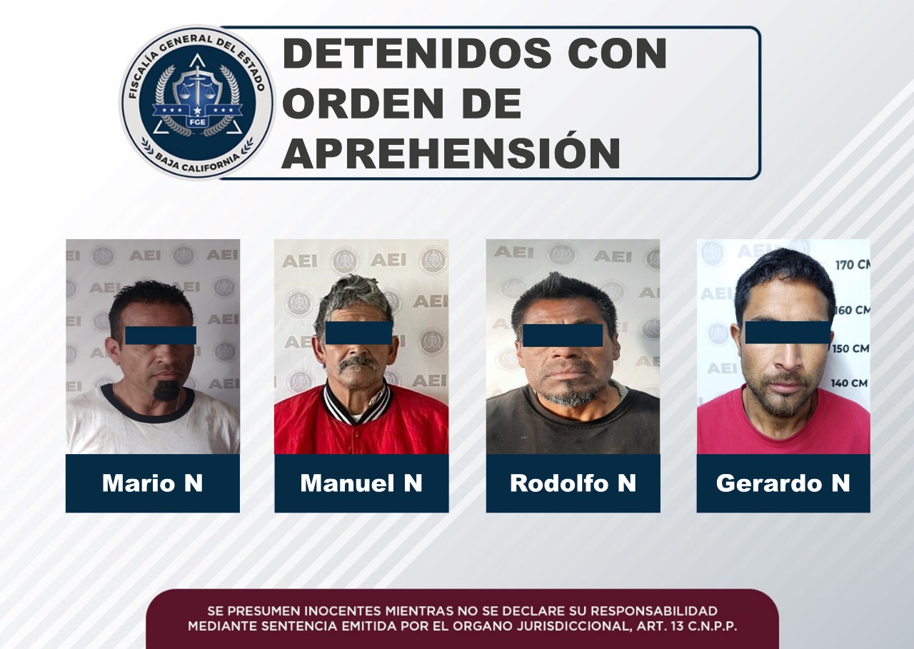ENSENADA, B.C. Agentes de la Fiscalía General del Estado (FGE), cumplimentaron órdenes de aprehensión a cuatro hombres por los delitos de violencia familiar, abuso sexual a menor de 14 años o incapaces, narcomenudeo y robo equiparado de vehículo en modalidad de desmantelamiento.