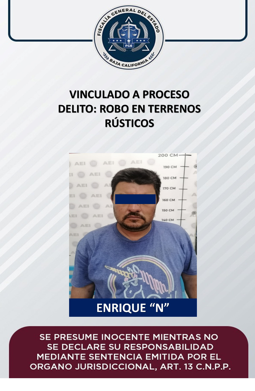 MEXICALI, B.C. La Fiscalía Regional de Mexicali, a través de la Unidad de Investigación Foránea de Guadalupe Victoria, logró la vinculación a proceso de un acusado del delito de robo a terrenos rústicos.