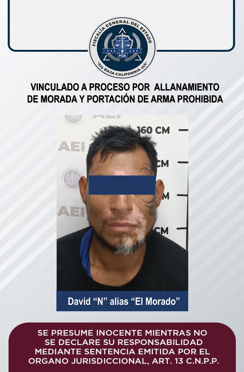 Durante la audiencia, el agente del Ministerio Público presentó al Juez de Control los elementos de prueba para acreditar la presunta responsabilidad de David “N”, alias “El Morado”, en los delitos de allanamiento de morada y portación de arma prohibida; además, se le impuso como medida cautelar prisión preventiva y dos meses de plazo para la investigación complementaria.