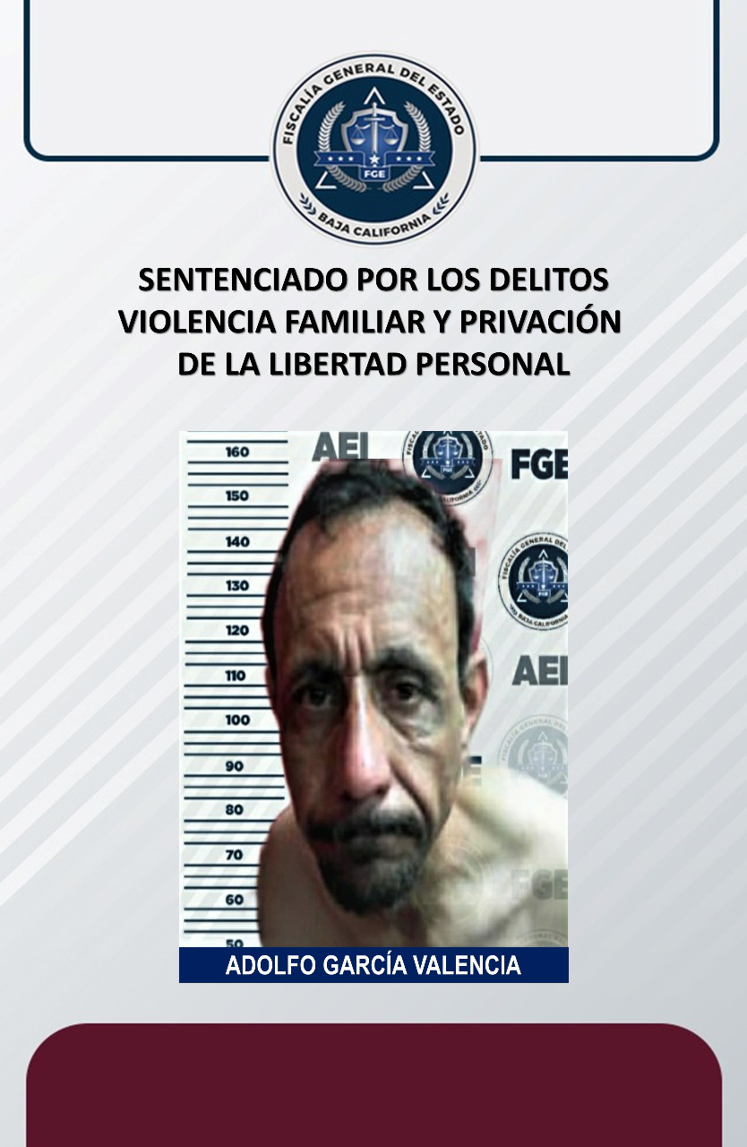MEXICALI, B.C. Con base a los elementos de pruebas presentados por la Fiscalía General del Estado, Adolfo García Valencia, responsable de los delitos de violencia familiar y privación de la libertad personal, recibió un fallo condenatorio de 5 años de prisión.
