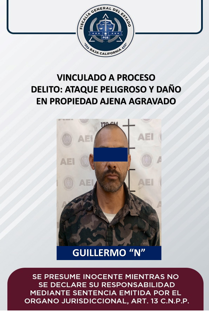 MEXICALI, B.C. La Fiscalía Regional de Mexicali, logró con base a los elementos de prueba aportados por la Unidad de Investigación con Detenidos Poniente, la vinculación a proceso de un imputado por los delitos de ataque peligroso y daño en propiedad ajena agravado por incendio.