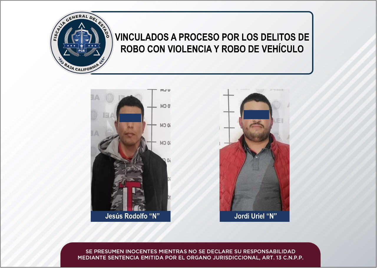 MEXICALI, B.C. La Fiscalía Regional de Mexicali obtuvo la vinculación a proceso de un par de individuos por los delitos de robo calificado cometido en establecimiento comercial abierto al público con violencia y robo de vehículo con violencia.
