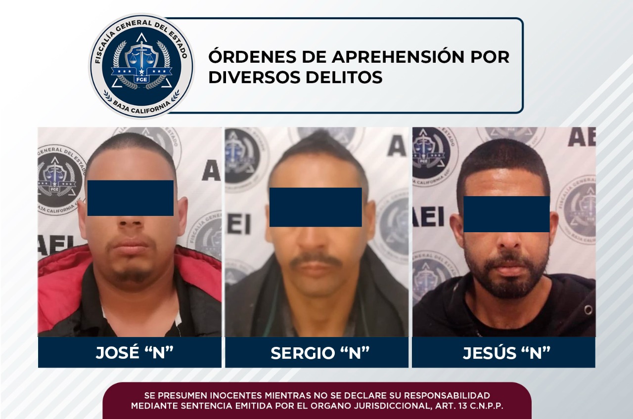 TIJUANA, B.C. La Fiscalía General del Estado (FGE), a través de la Agencia Estatal de Investigación (AEI) aprehendió a tres personas por diversos delitos, esto, derivado de solicitudes realizadas por el Ministerio Público ante los jueces de control.