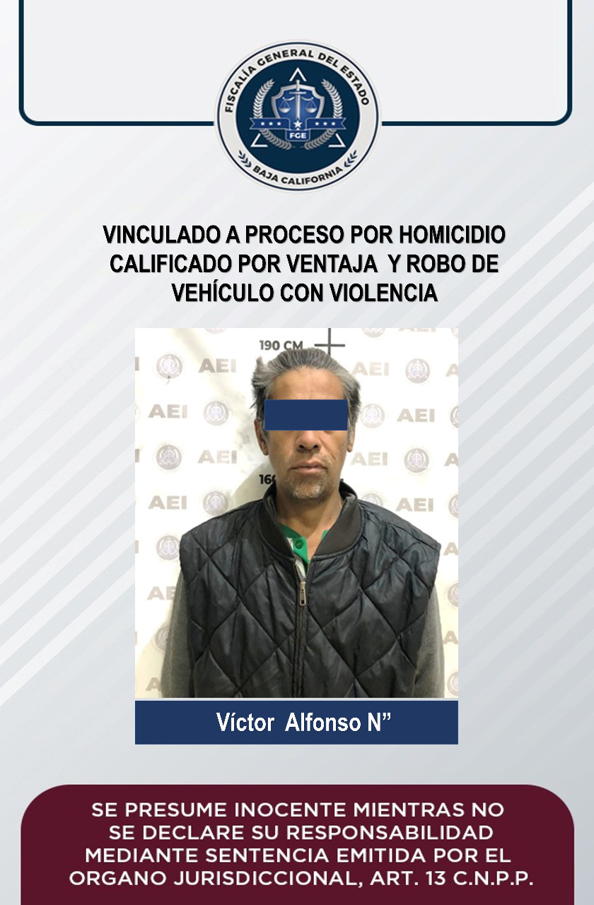 MEXICALI, B.C. La Fiscalía General del Estado (FGE), logró vincular a proceso a un sujeto por los delitos de homicidio calificado por ventaja y robo de vehículo de motor con violencia.