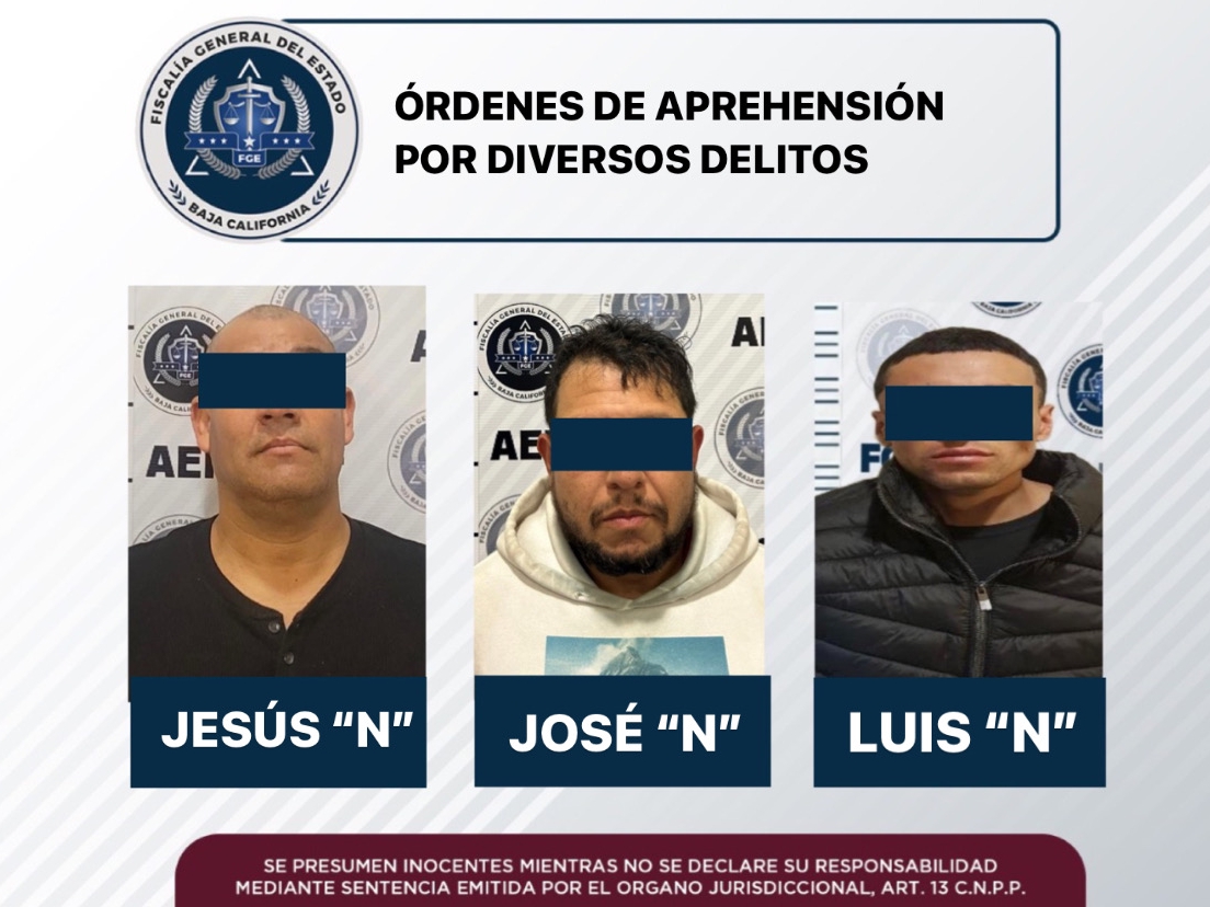 TIJUANA, B.C. Por tener cuentas pendientes con la justicia, tres sujetos fueron detenidos por elementos de la Fiscalía General del Estado (FGE), adscritos a la Agencia Estatal de Investigación (AEI), quienes dieron cumplimiento a las órdenes de aprehensión en distintas zonas de la ciudad.