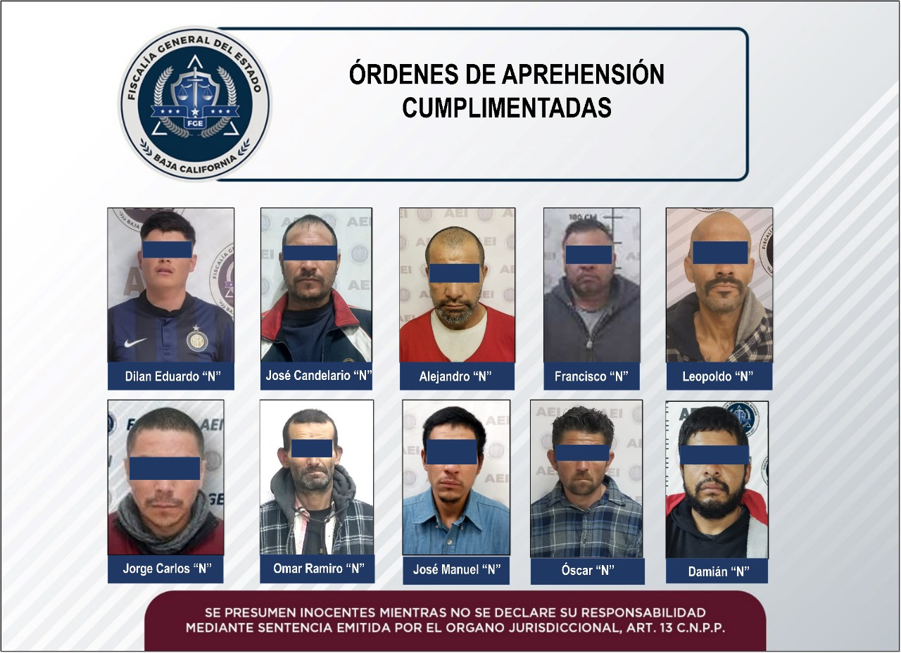 MEXICALI, B.C. Dando continuidad a las investigaciones, elementos de la Agencia Estatal de Investigación (AEI), aseguraron a 10 hombres que contaban con orden de aprehensión por delitos de robo en diferentes modalidades, daño en propiedad ajena, violencia familiar y allanamiento de morada.
