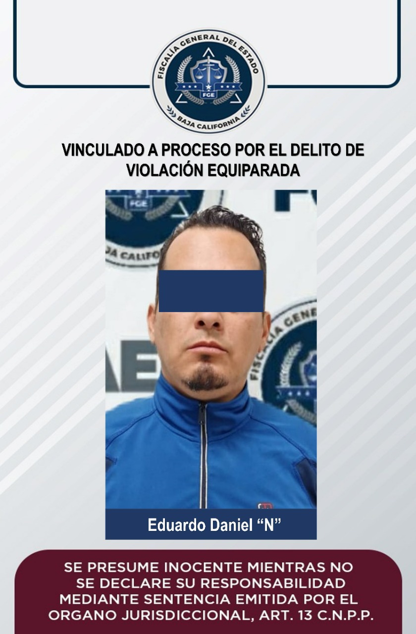 MEXICALI, B.C. La Fiscalía General de Baja California, a través de la Fiscalía Especializada en Delitos contra la Mujer por Razón de Género, obtuvo auto de vinculación a proceso penal en contra de Eduardo Daniel “N”, acusado del delito de violación equiparada.