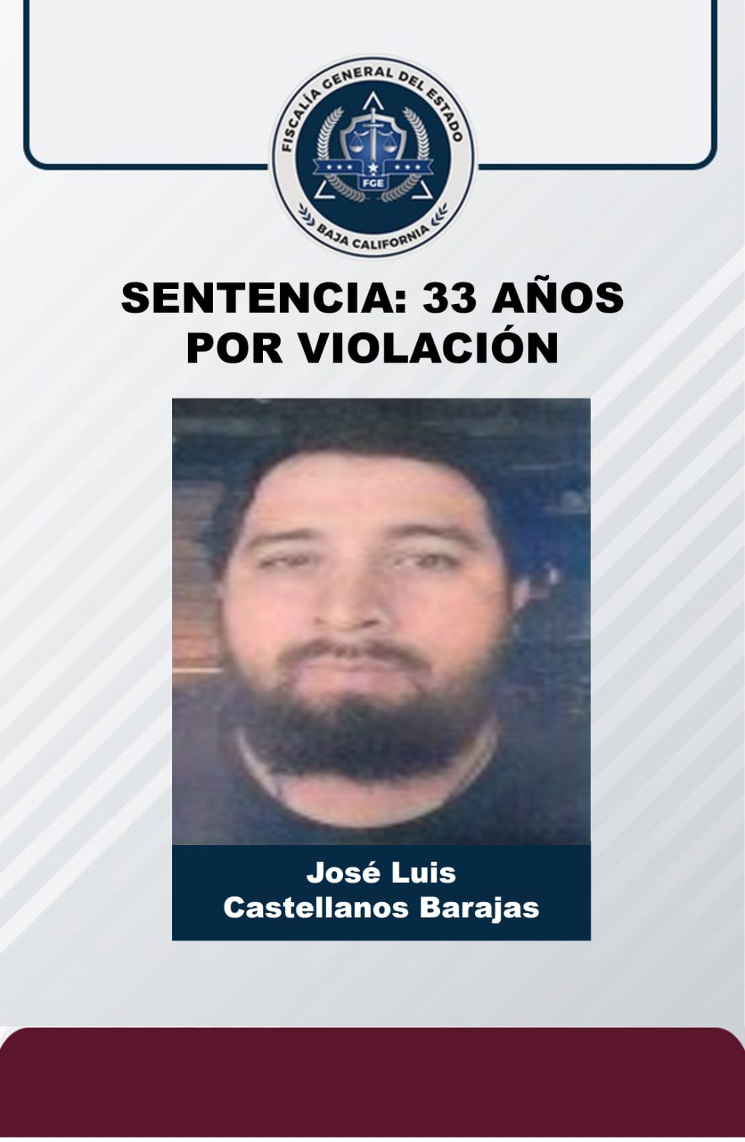 ENSENADA, B.C. La Fiscalía General del Estado (FGE), logró sentencia condenatoria de 33 años de prisión contra José Luis Castellanos Barajas, de 31 años de edad, culpable de violación agravada por razón de parentesco.