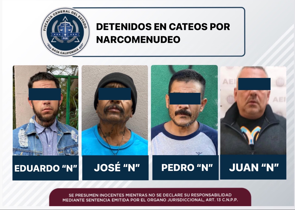 TIJUANA, B.C. Continuando con el combate al delito de narcomenudeo, la Fiscalía General del Estado, a través de la Fiscalía Especializada en Narcomenudeo, en coordinación con la Secretaría de Marina Armada y la Guardia Nacional, detuvo a cuatro personas durante igual número de cateos.