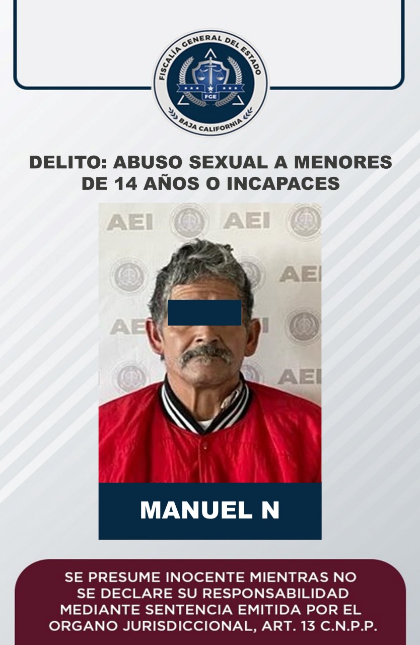 ENSENADA, B.C. 3 DE ENERO DE 2023.- Auto de formal prisión logró la Fiscalía General del Estado contra Manuel “N”, de 58 años de edad, capturado en diciembre del año pasado en el municipio de Ensenada, en cumplimiento de la orden de aprehensión que pesaba en su contra por el delito de abuso sexual a menores de 14 años o incapaces.