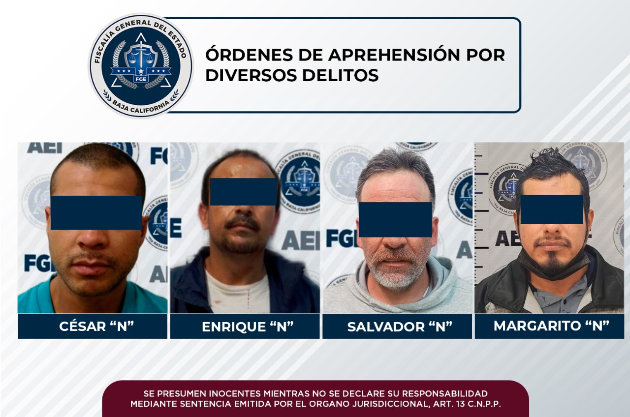 TIJUANA, B.C. Por contar con una orden de arresto emitida por un Juez de Control, cuatro sujetos fueron aprehendidos en diferentes diligencias efectuadas por elementos de la Agencia Estatal de Investigación (AEI) de la Fiscalía General del Estado (FGE).