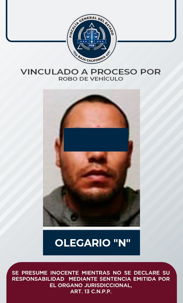 PLAYAS DE ROSARITO, B.C. Datos de prueba aportados por la Fiscalía Regional de Playas de Rosarito, permitieron obtener la vinculación a proceso de Olegario “N”, señalado por el delito de robo equiparado de vehículo de motor en la modalidad de uso de vehículo.