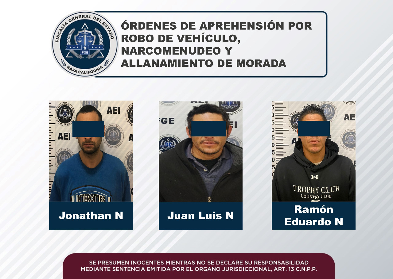 TIJUANA, B.C. Derivado de labores de investigación desarrolladas por agentes de la Fiscalía General del Estado, fue posible la cumplimentación de órdenes de aprehensión contra tres individuos, señalados de robo de vehículo, narcomenudeo y allanamiento de morada.