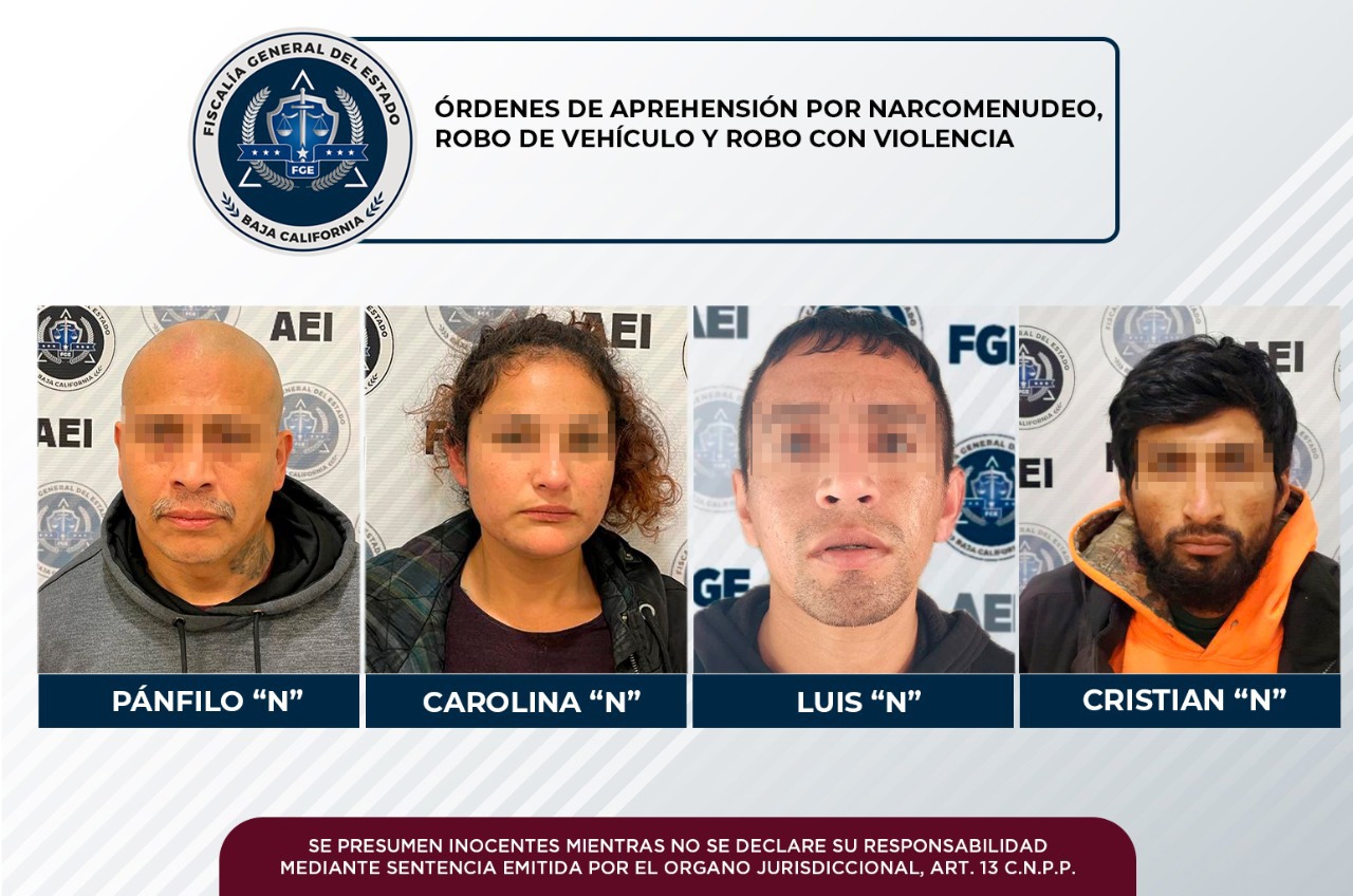 TIJUANA, B.C. Tres hombres y una mujer aprehendidos en Tijuana, deberán responder ante la justicia, por estar presuntamente relacionados en delitos de narcomenudeo, robo de vehículo y robo con violencia, informa la Fiscalía General del Estado.