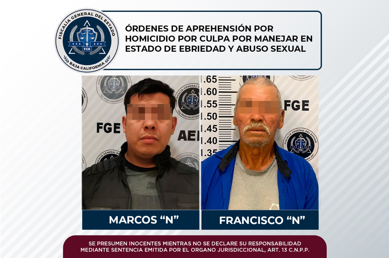 TIJUANA, B.C. Labor de gabinete y campo efectuada por agentes de la Fiscalía General del Estado, derivó en la aprehensión de dos hombres que, en casos distintos, son señalados de los delitos de homicidio por culpa por manejar en estado de ebriedad y abuso sexual.