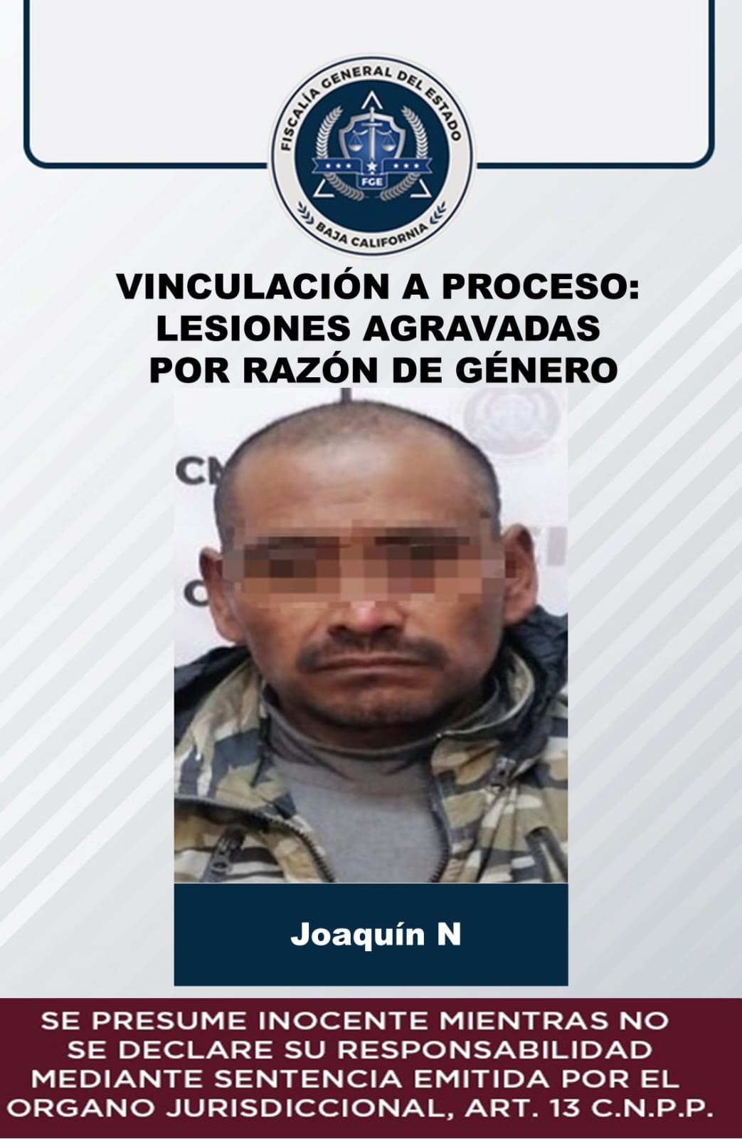 ENSENADA, B.C. La Fiscalía General del Estado obtuvo la vinculación a proceso de Joaquín “N”, de 49 años de edad, por el delito de lesiones agravadas por razón de género, presuntamente, cometido en agravio de su pareja sentimental.